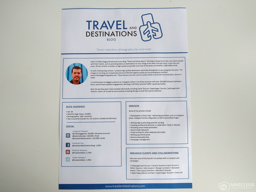 If you are a travel blogger it’s important that you take with you a press/media kit. This is a document that contains information about you, what you offer, some of your stats, as well as previous collaborations. I recommend only have one sheet of paper and printing on both sides.