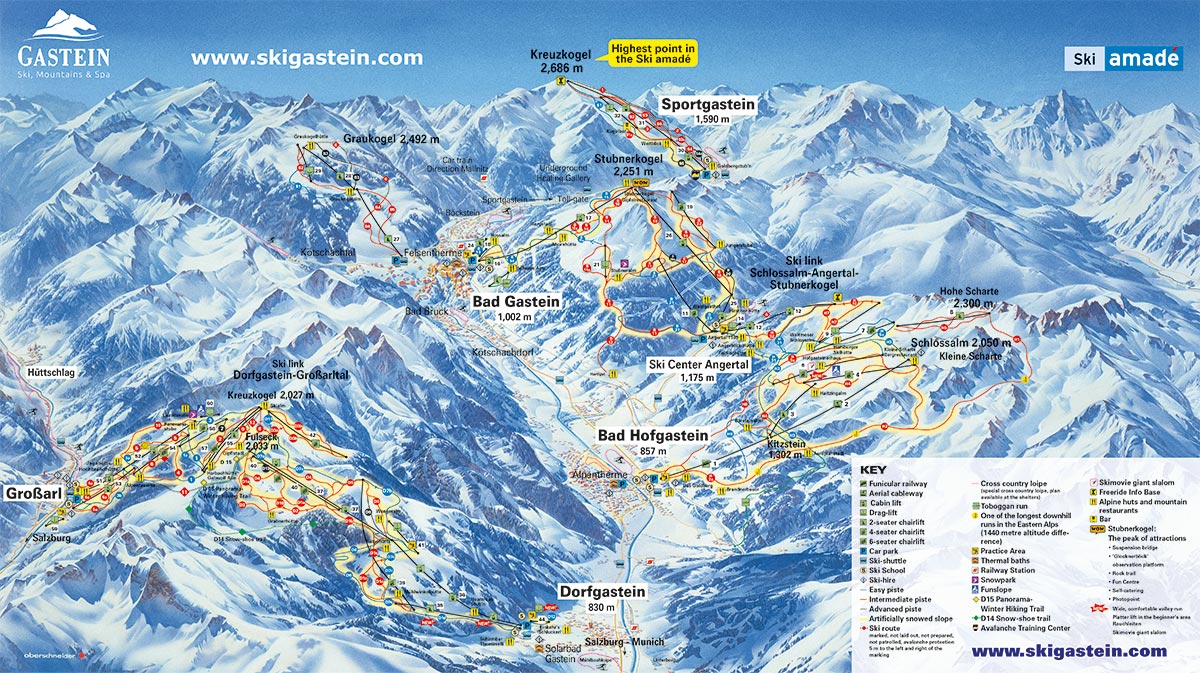 The ski areas in the Gastein valleys are part of Ski amadé region and consist of the ski link Schlossalm-Stubnerkogel-Angertal, Sportgastein and Graukogel areas, as well as the ski link Dorfgastein-Grossarl areas. Including these Gastein areas, pass holders have access to a total of 5 resorts, 25 villages and 760km of ski area from Ski amadé, making it one of the largest areas in Europe. Within the entire ski area are 270 lifts, which include 90 chair lifts, 47 gondola lifts, 81 drag/tow lifts and 52 practice lifts. The various Ski amadé resorts are accessible via car and other transport.